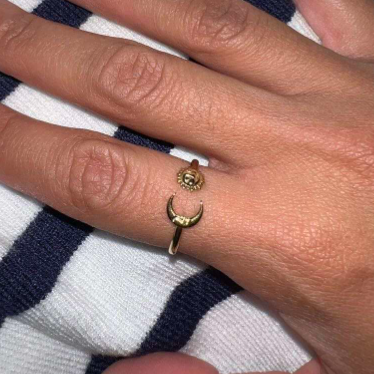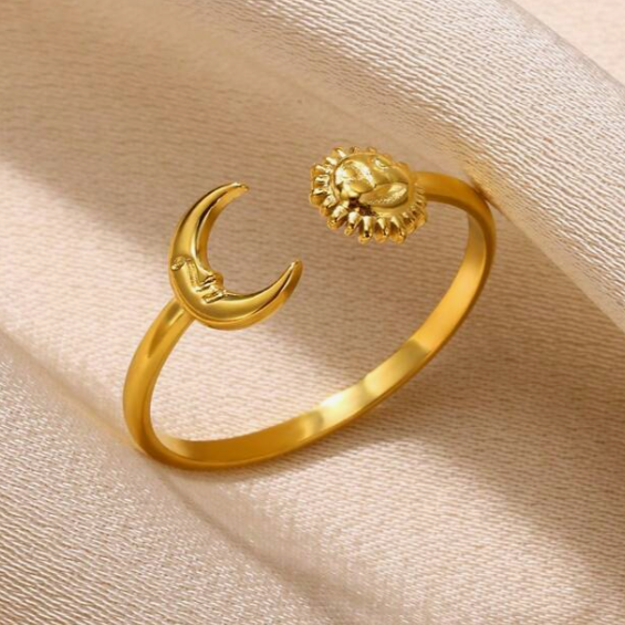 Unleash your inner celestial being with our Stainless Steel Sun & Moon Shaped Open Ring. Made of durable stainless steel in a stunning yellow gold color, this ring is perfect for women and couples alike. The intricate abstract design on each side adds a touch of mystique to any outfit.
