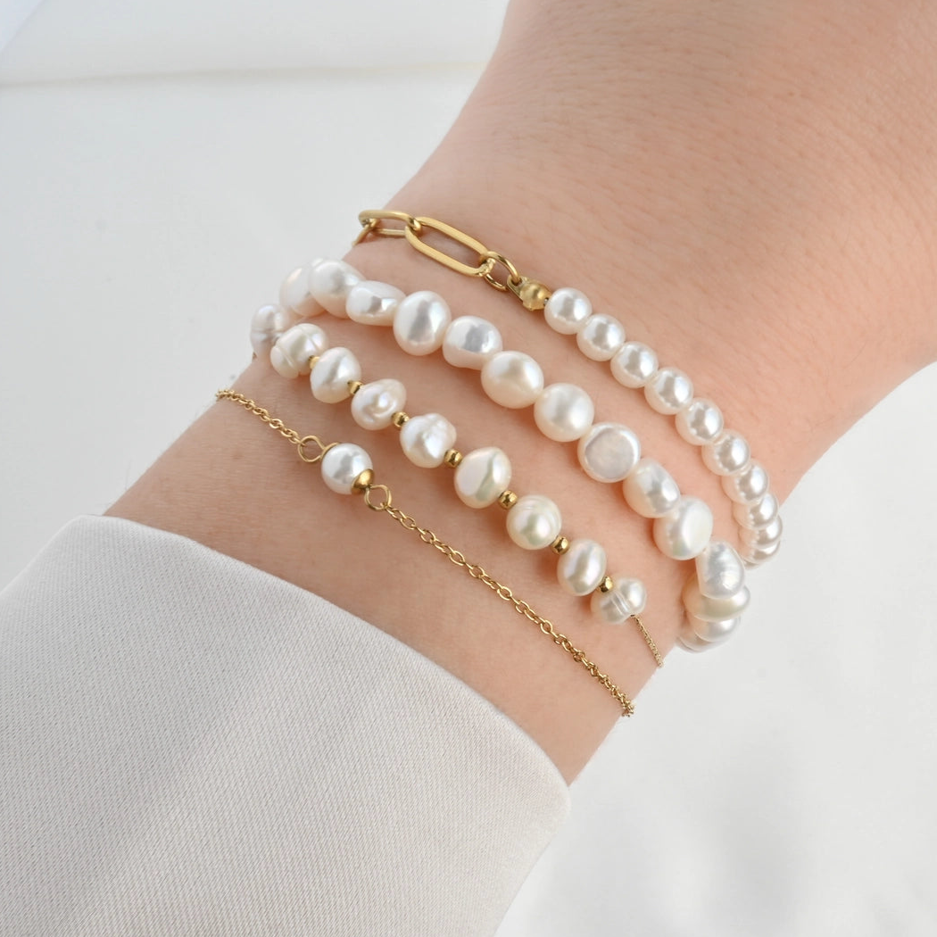 Wear them solo or stack them with dainty gold chains, these elegant pearl bracelets will greatly elevate your outfit. They come in four different designs made of stainless steel or brass : A. single pearl ; B. pearl with gold spacer beads ; C. full pearl ;and D. half pearl, half paperclip chain .