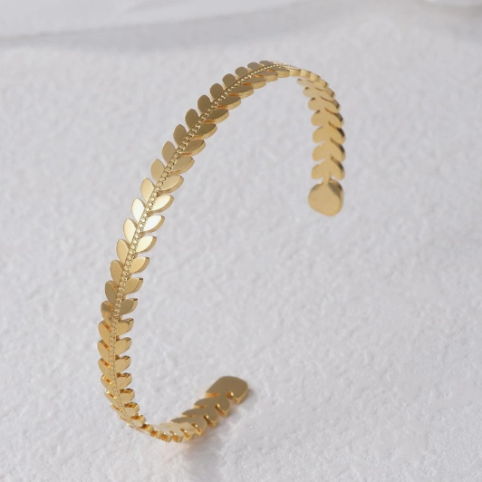 This Fashion Stainless Steel Ear of Wheat Design Cuff Bangle is a stylish, timeless piece perfect for women who appreciate quality and elegance. Made with durable stainless steel, it is resistant to tarnishing and features a stunning gold color that will elevate any outfit. Add a touch of sophistication to your wardrobe with this beautiful cuff bangle.