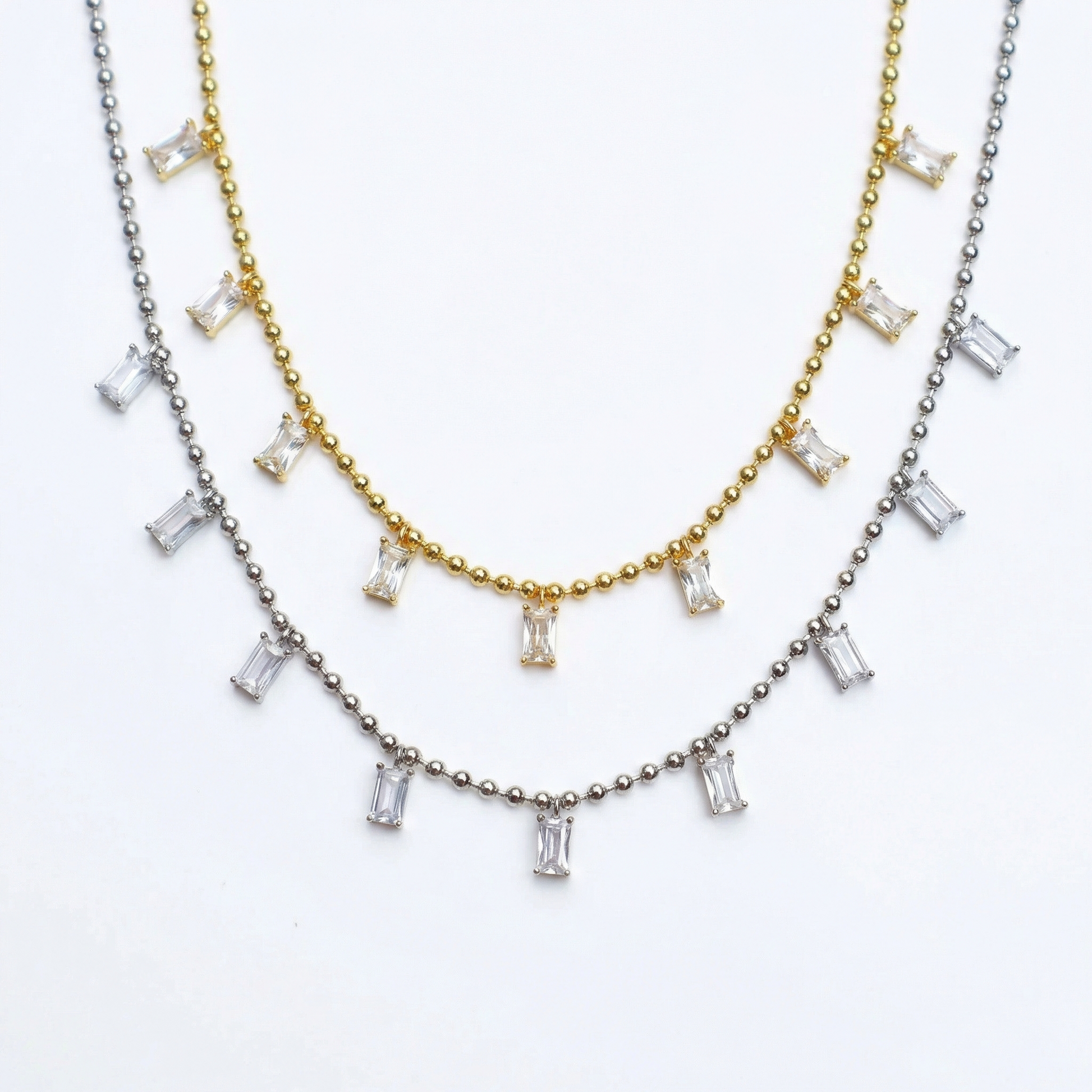A refined necklace featuring delicate beads accented with a subtle crystal baguette charm. Its minimalist design adds a soft touch of sparkle while maintaining a clean, modern aesthetic.