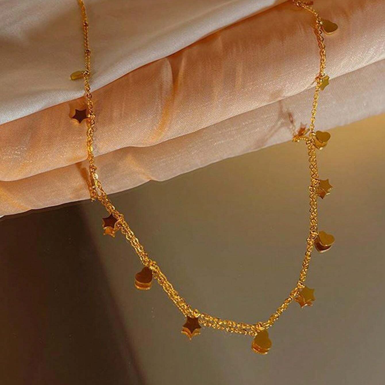 A delicate stainless steel choker necklace featuring minimalist star and heart pendants. With a fashionable design and a radiant yellow gold finish, this necklace is perfect for women who love understated elegance. Lightweight and versatile, it’s ideal for daily wear or as a thoughtful gift for someone special.