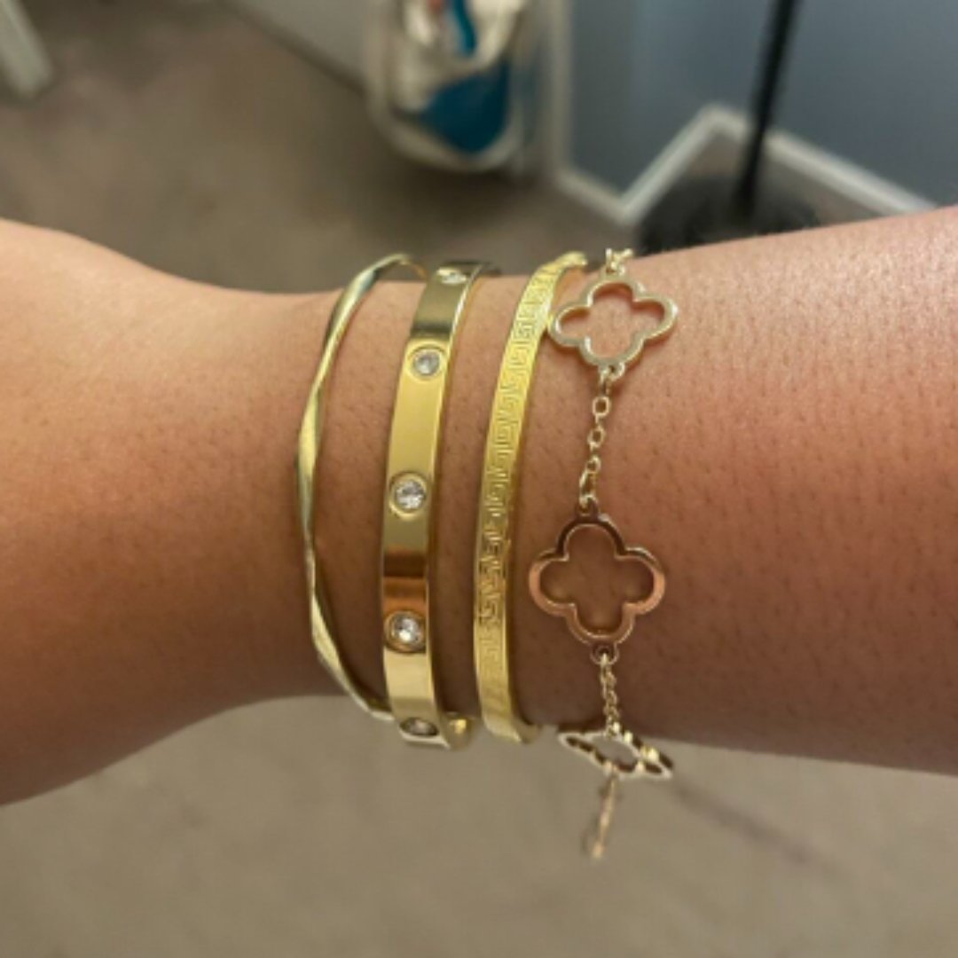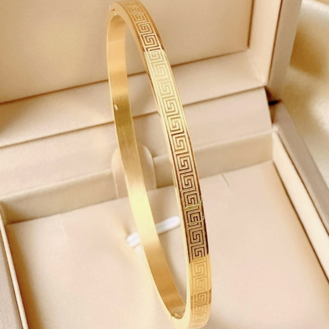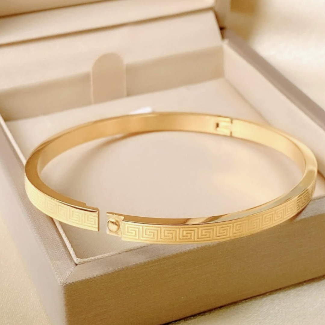 This textured detail bangle is expertly crafted in durable stainless steel and finished in a luxurious yellow gold tone. Designed for women, it adds a touch of sophistication to any outfit. Its unique texture elevates its elegant appearance, making it a must-have accessory for any fashion-forward individual.